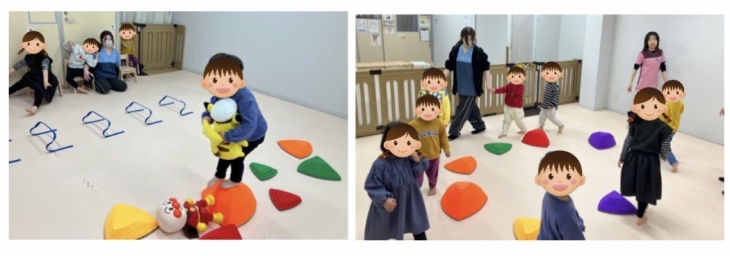 運動の「だるまさんが転んだ」では、ルール理解やバランス、スピードコントロールを目的として行いました。難易度を上げてバランスストーンやバランス橋を歩いたりハードルをまたぎながら先生のところまで向かいました。先生が振り向いたらピタッと止まるルールを守り、バランスを取りながら進むことができていました☺