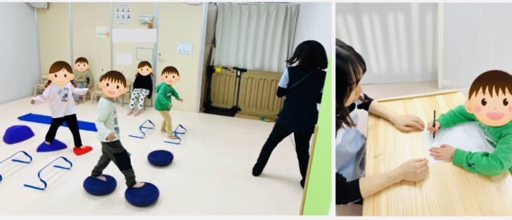 本日はペアサーキットを行いました。ストーンを渡り、一本橋を渡って、ボールを投げを行いました。その後、少し高いハードルを3つジャンプ。体幹にアプローチをしたり、力加減の調整をしたりと、様々な身体の機能を使っていきました。一本橋では、バランスをとるのが難しかったですが、一生懸命に挑戦しました☺️ジャンプではハードルを越えれるよう、ハードルをよく見て跳ぶ挑戦をしました(^_^)