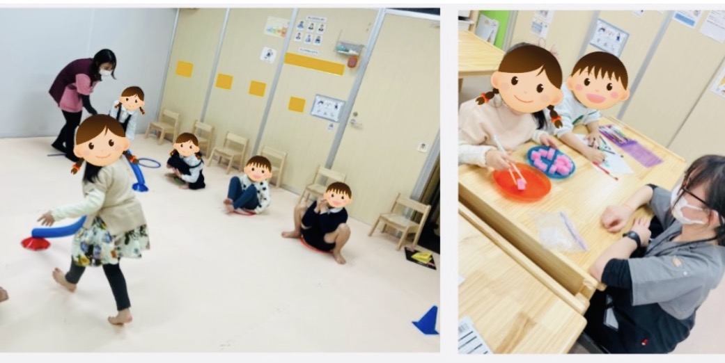 個別課題ではバランスを取る練習を行いました。地面で行うと不安定になる姿が見られたのでバランスクッションや輪っかの中など明確な場所で取り組むと自分でバランスを取り5秒静止することができていました👏