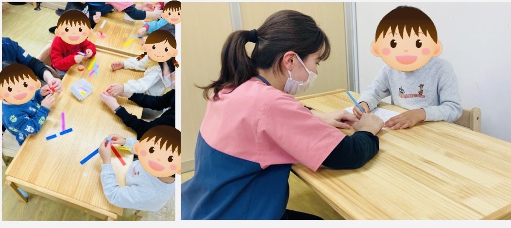 今日の個別課題では、なぞり書きをプリントで行いました。線からはみ出ないように気を付けながら進めました。「き」の字はハネの部分が伸びてしまうので注意して進めていきたいです。